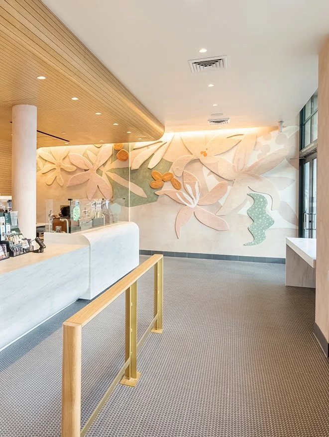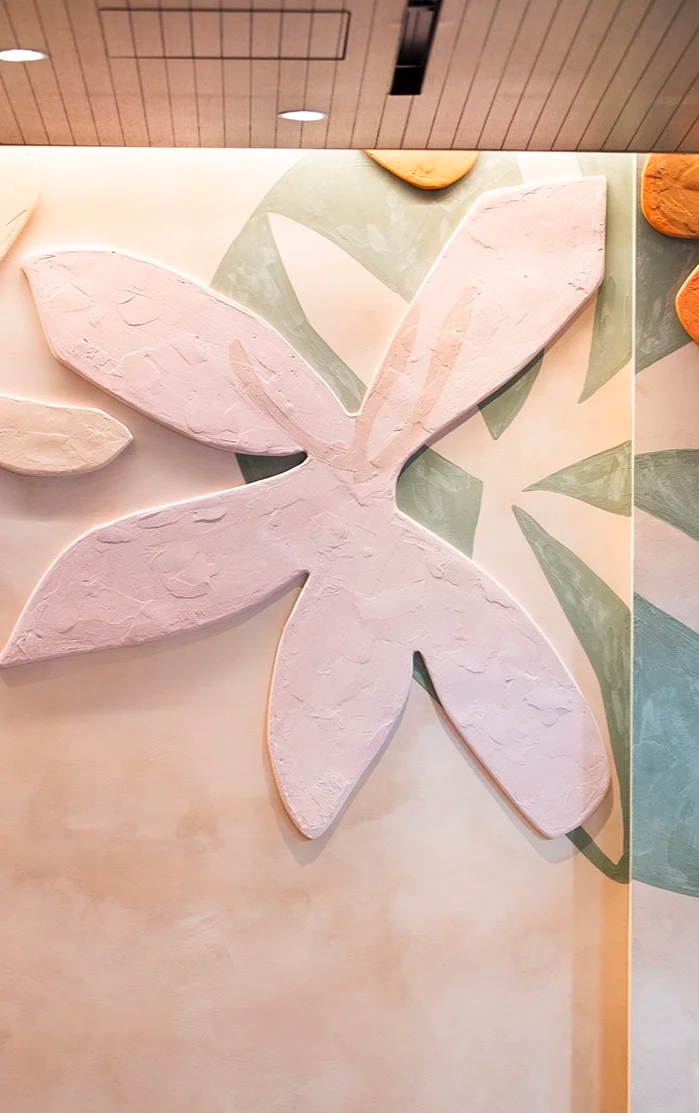 Fabricated dimensional shapes with plaster texture detail, full mural painted in lime wash.
