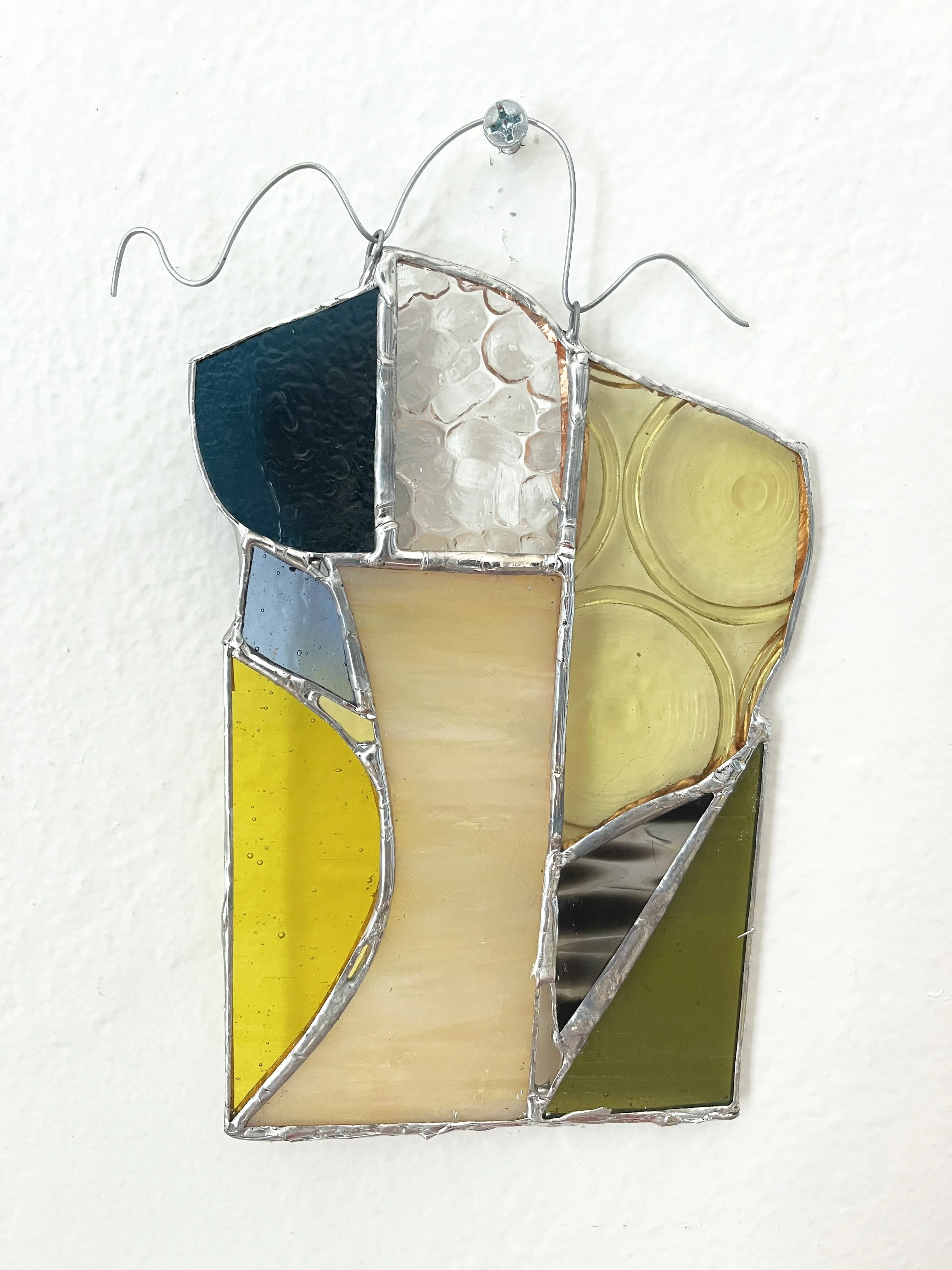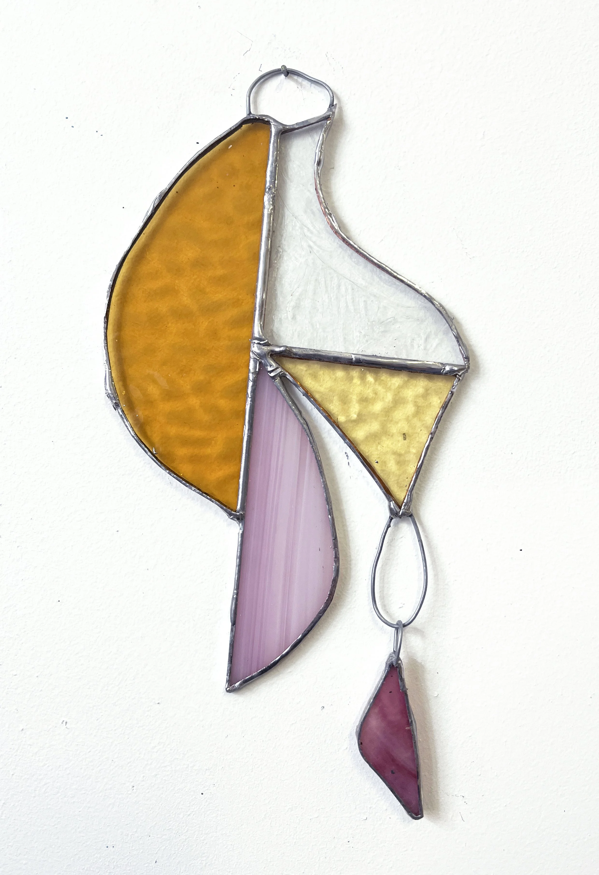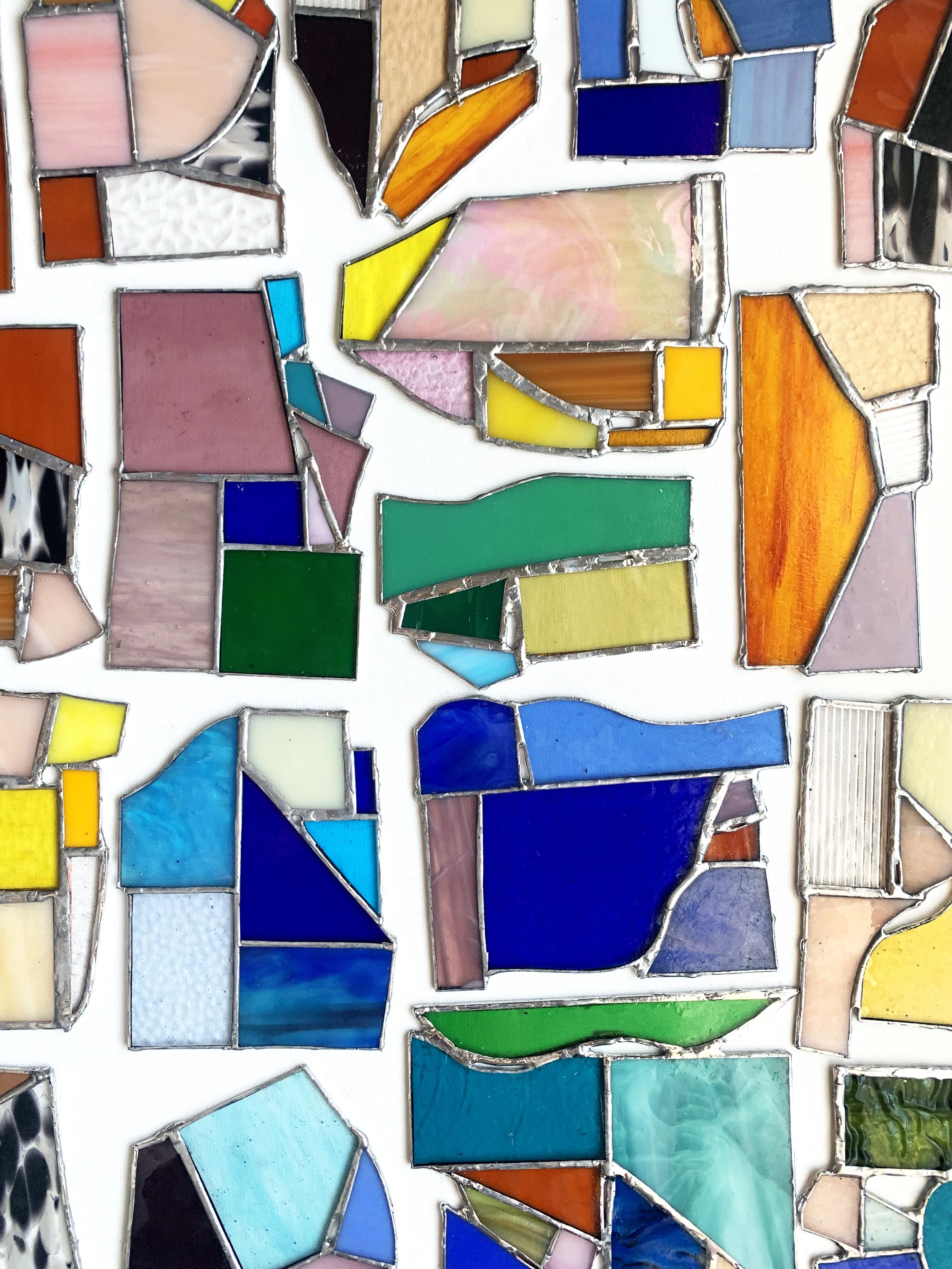My exploration in stained glass started the summer of 2021. Each stained glass piece I create is entirely its own—no two the same. My process of making is intuitive, loose and organic. Whatever pieces are left behind go on to inform the next. I strive for varying texture in everything, letting the soldering create a sense of movement and sculpture between the pieces. Holes left for light to shoot through, gaps for breath and balance. Love letters to the light.